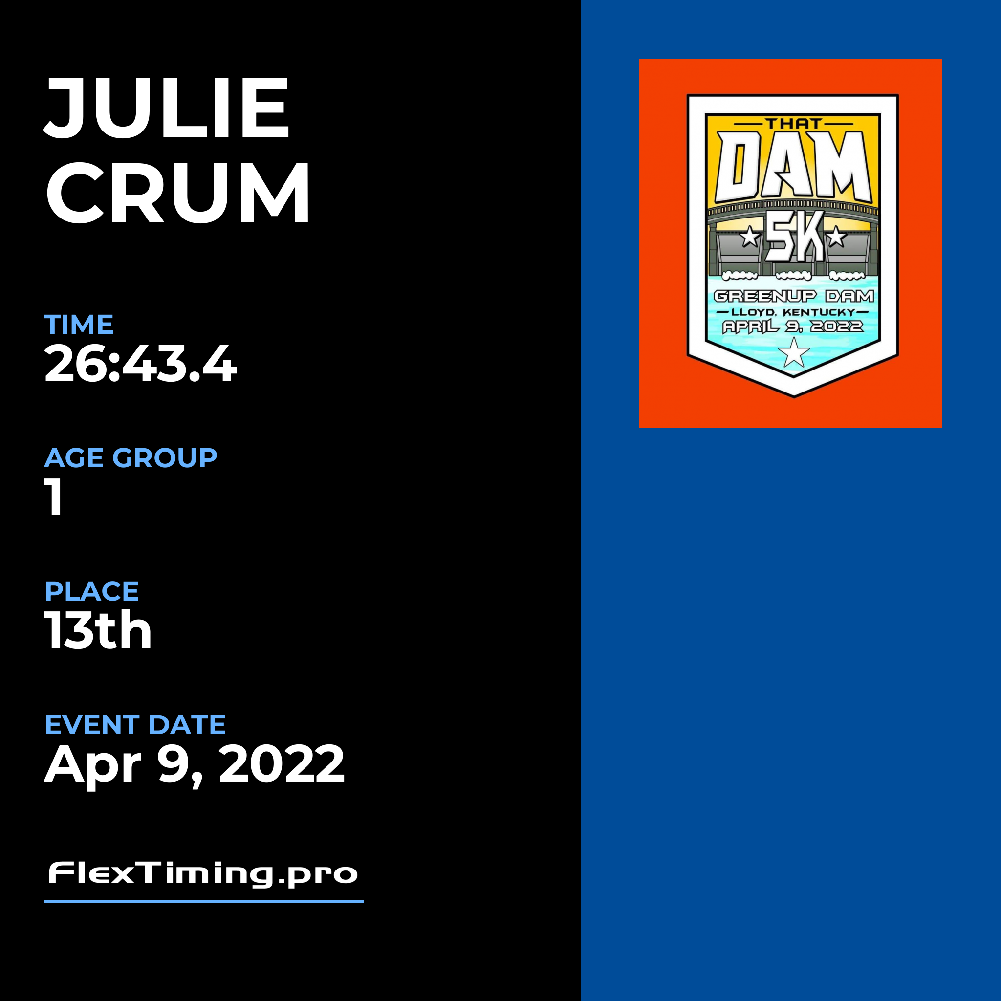 | Age Group Place: | 1 out of 7 Female in your Age Group. |