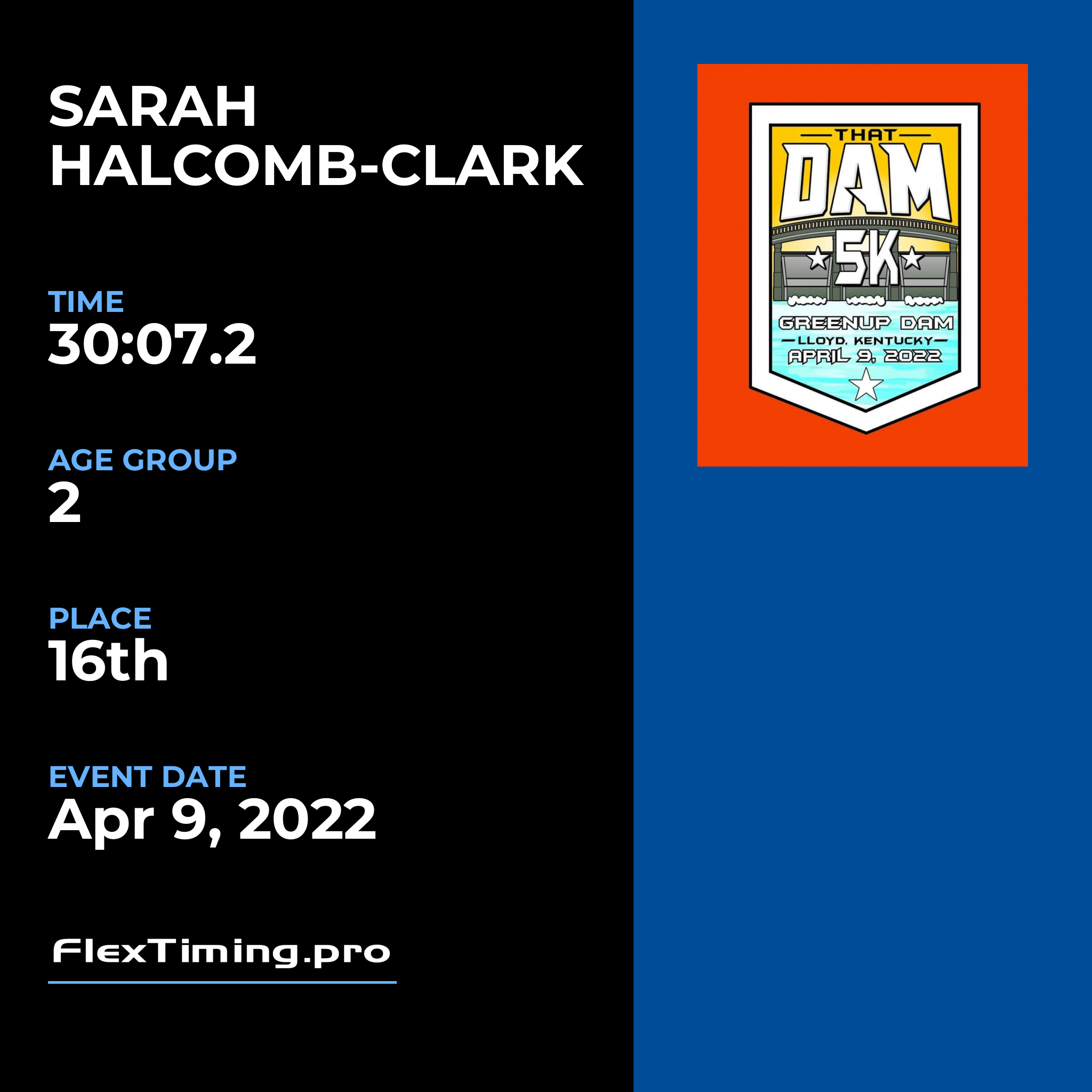 | Age Group Place: | 2 out of 5 Female in your Age Group. |