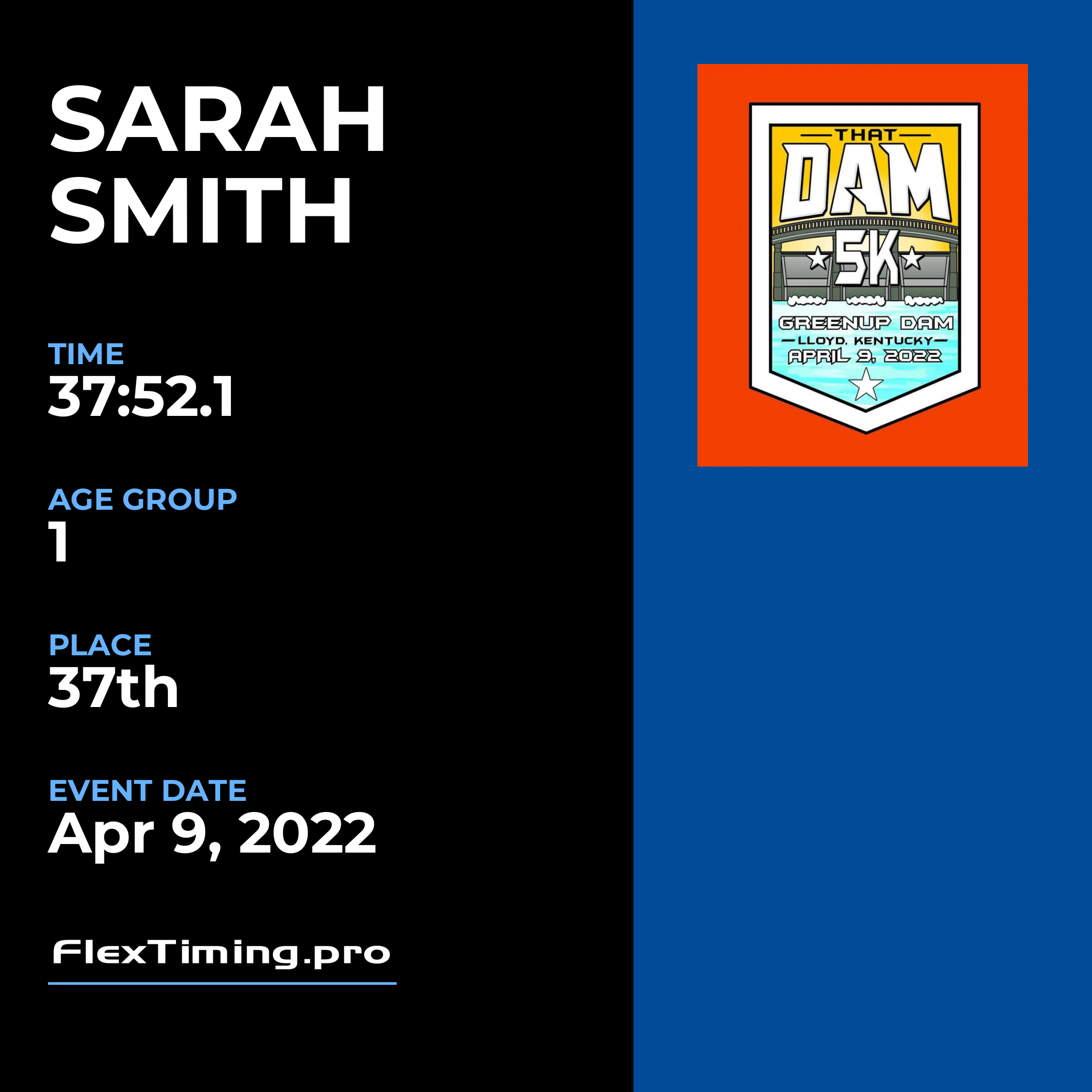 | Age Group Place: | 1 out of 2 Female in your Age Group. |