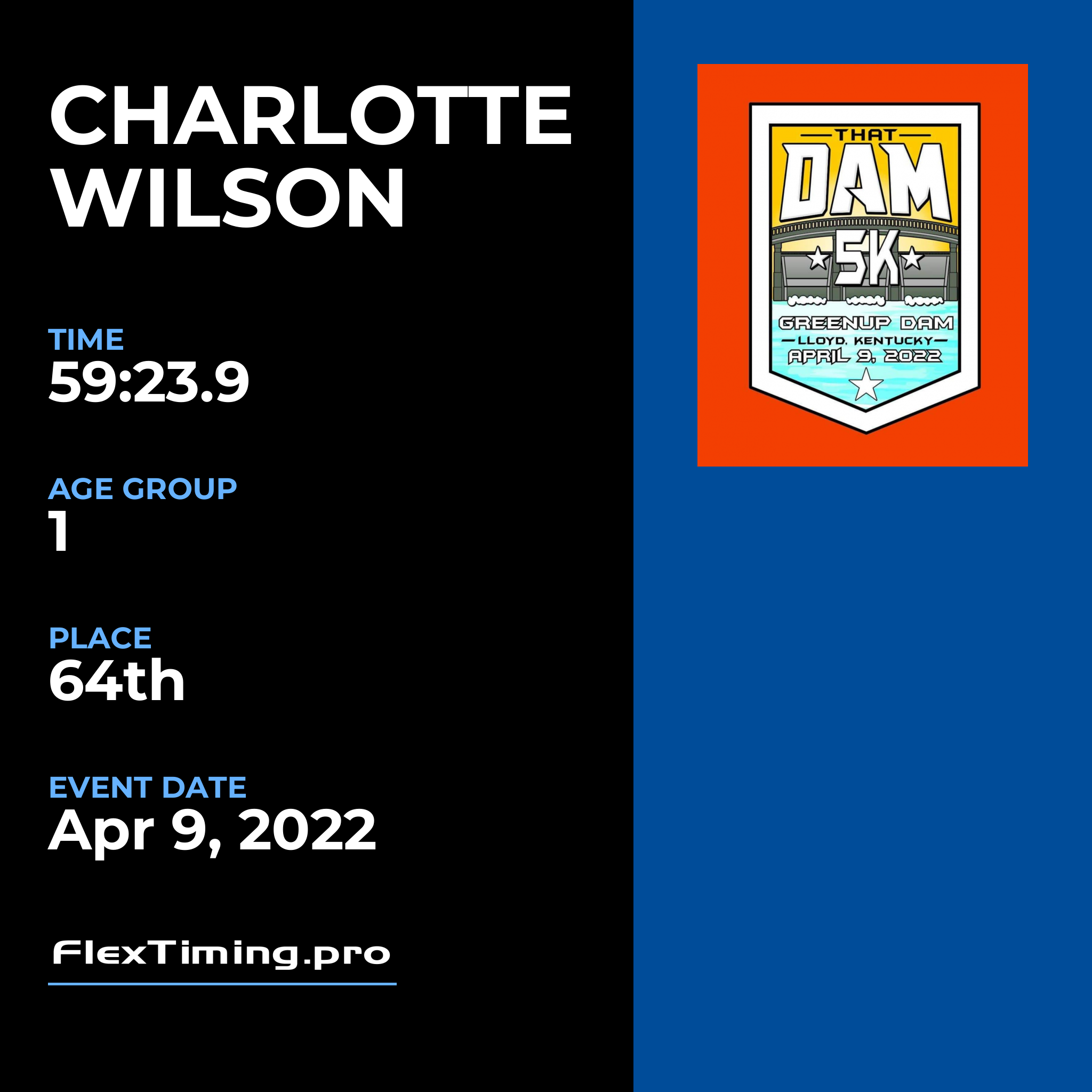 | Age Group Place: | 1 out of 1 Female in your Age Group. |