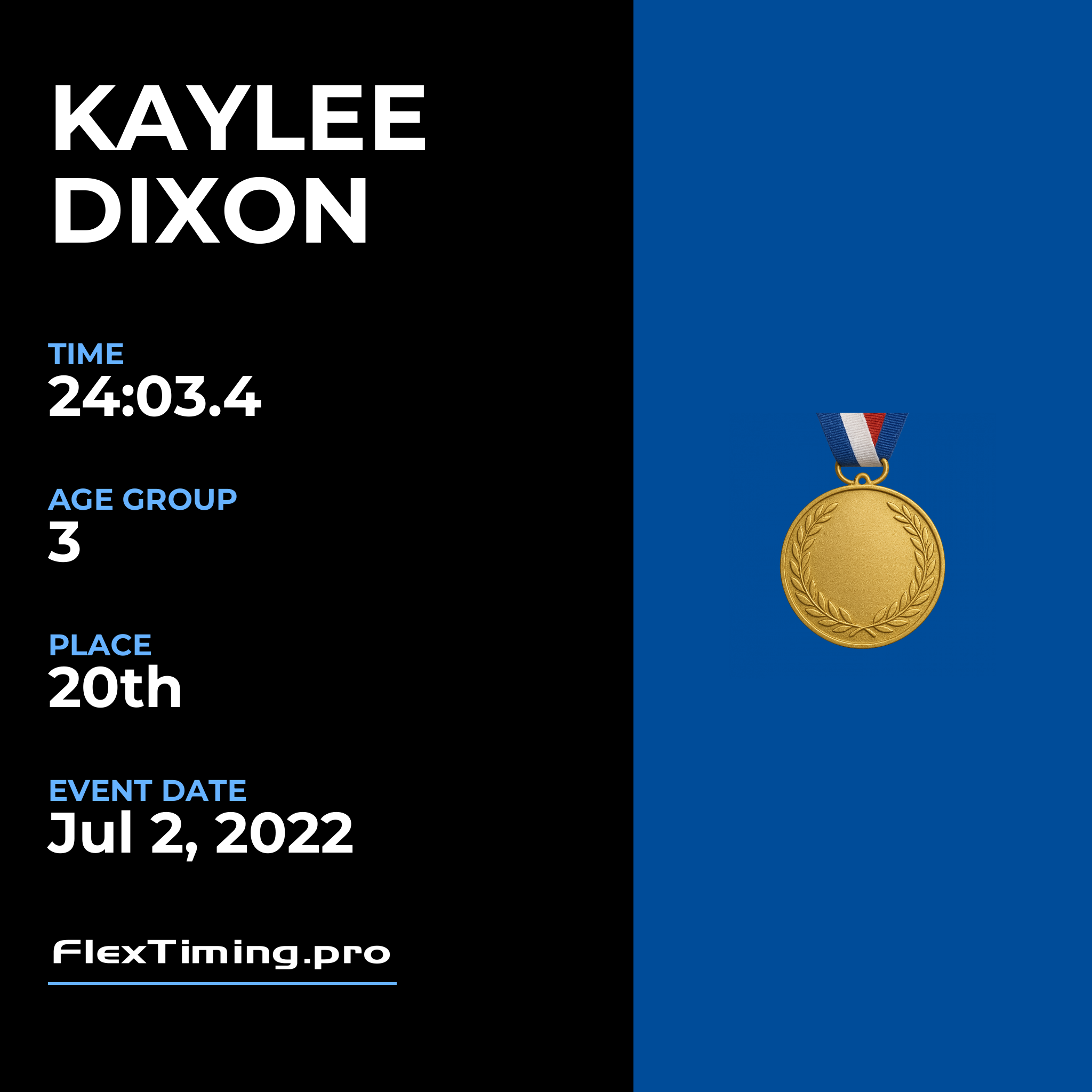 | Age Group Place: | 3 out of 4 Female in your Age Group. |