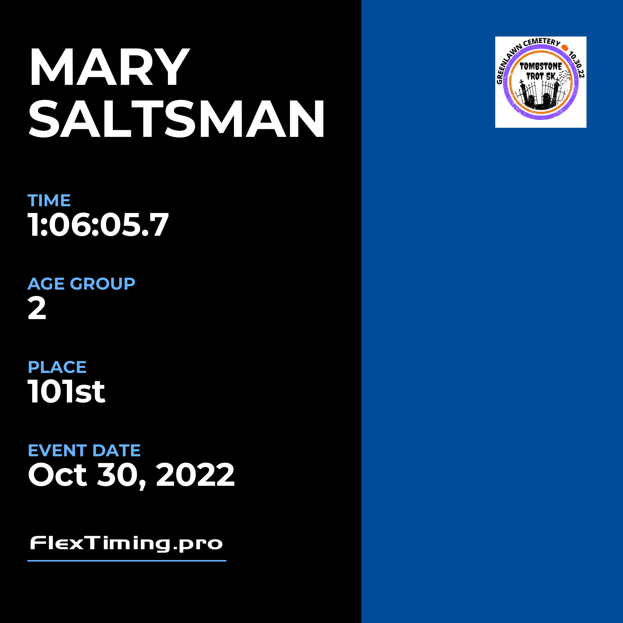 | Age Group Place: | 2 out of 2 Female in your Age Group. |