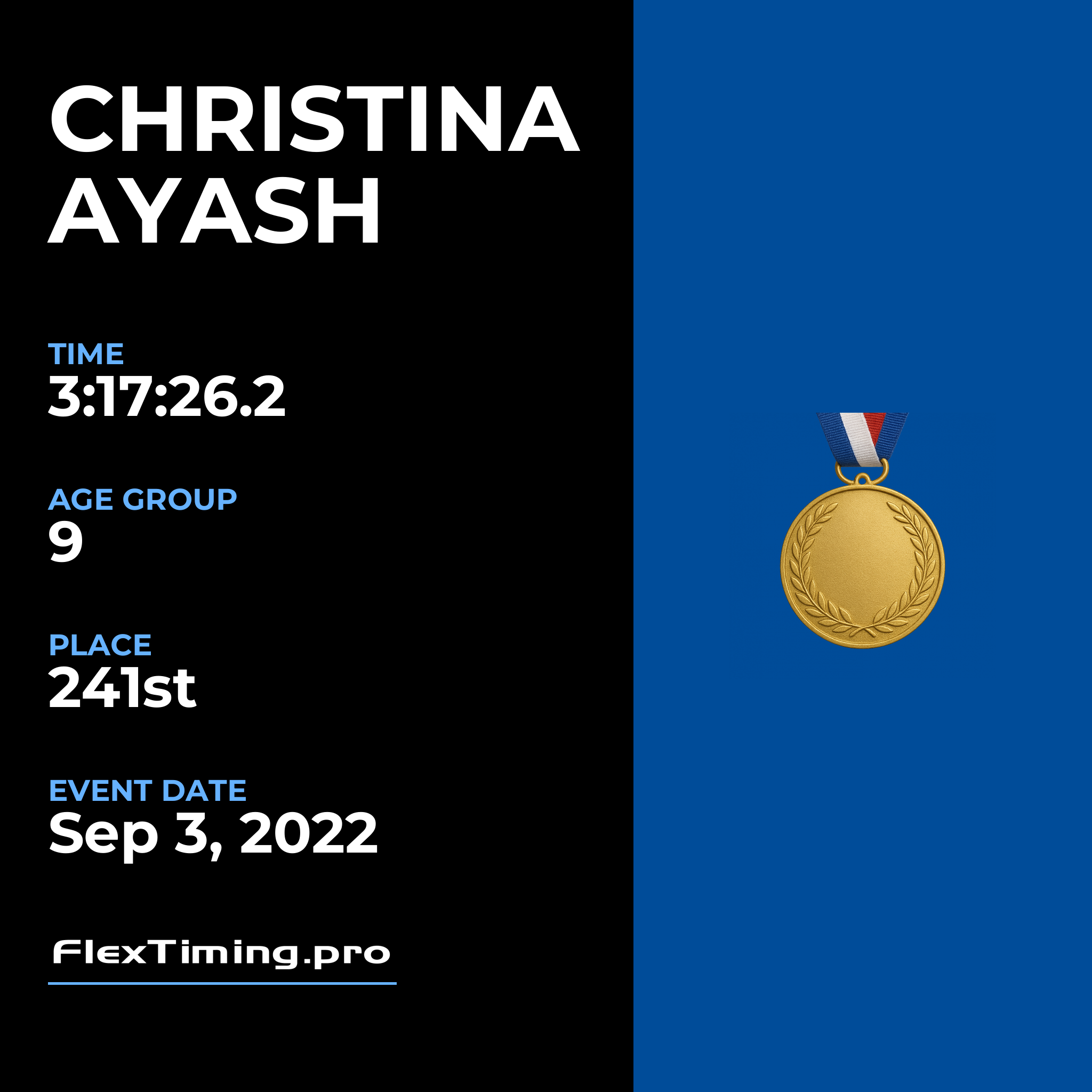 | Age Group Place: | 9 out of 10 Female in your Age Group. |