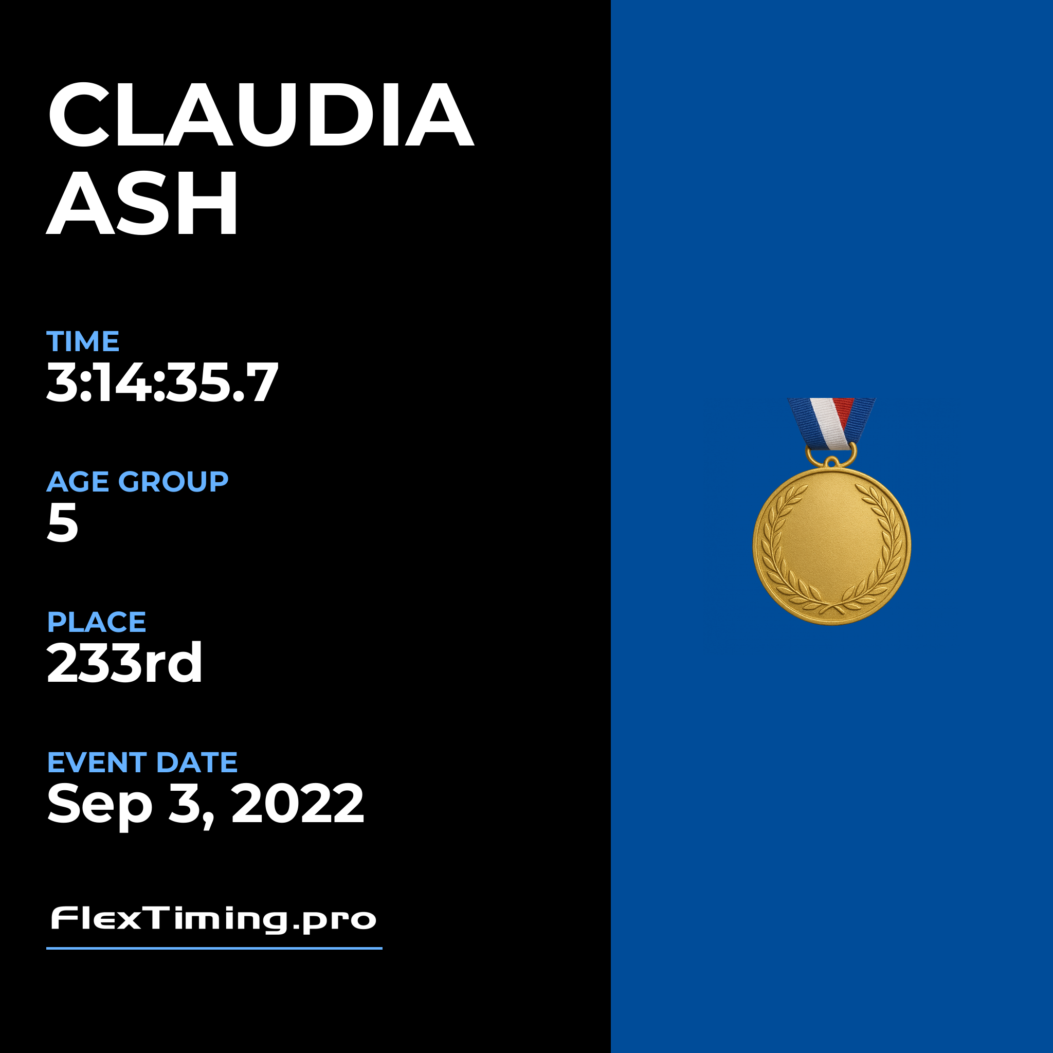 | Age Group Place: | 5 out of 5 Female in your Age Group. |