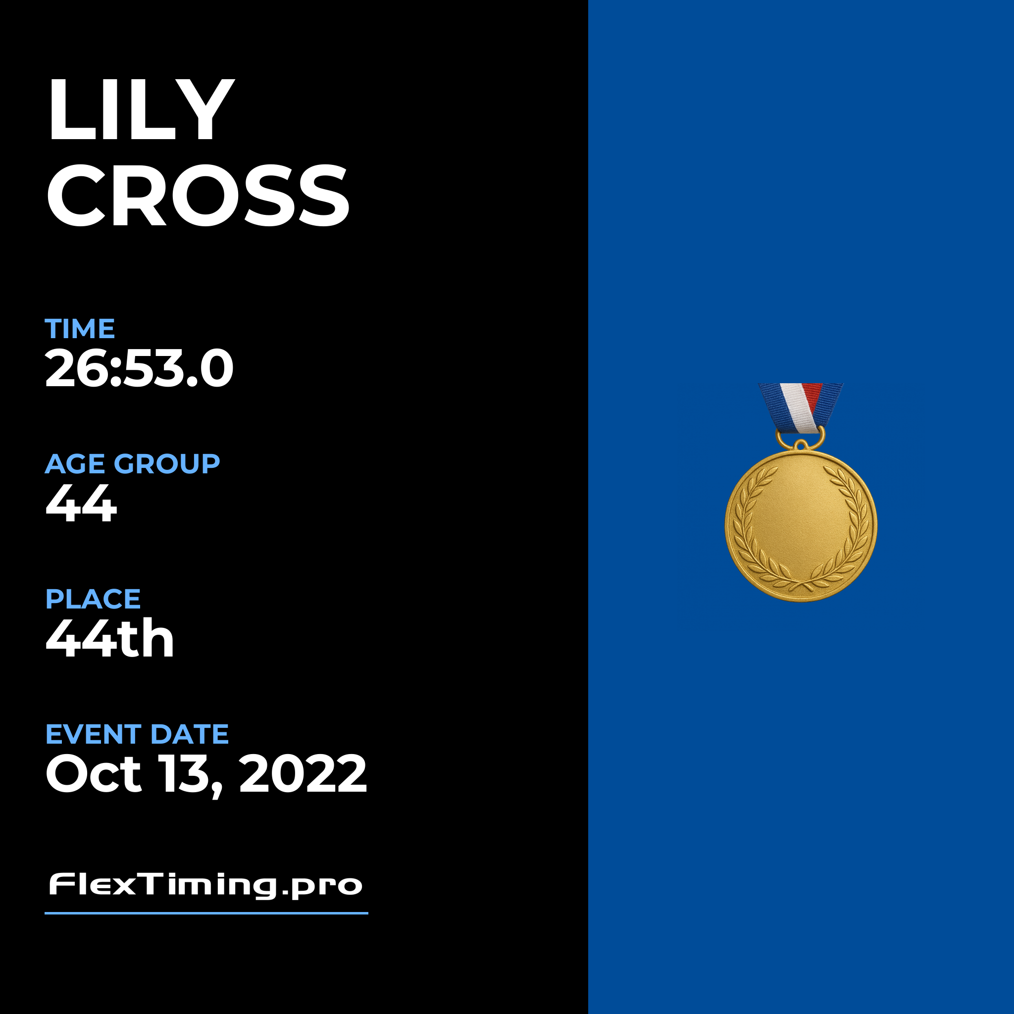 | Age Group Place: | 44 out of 74 Female in your Age Group. |