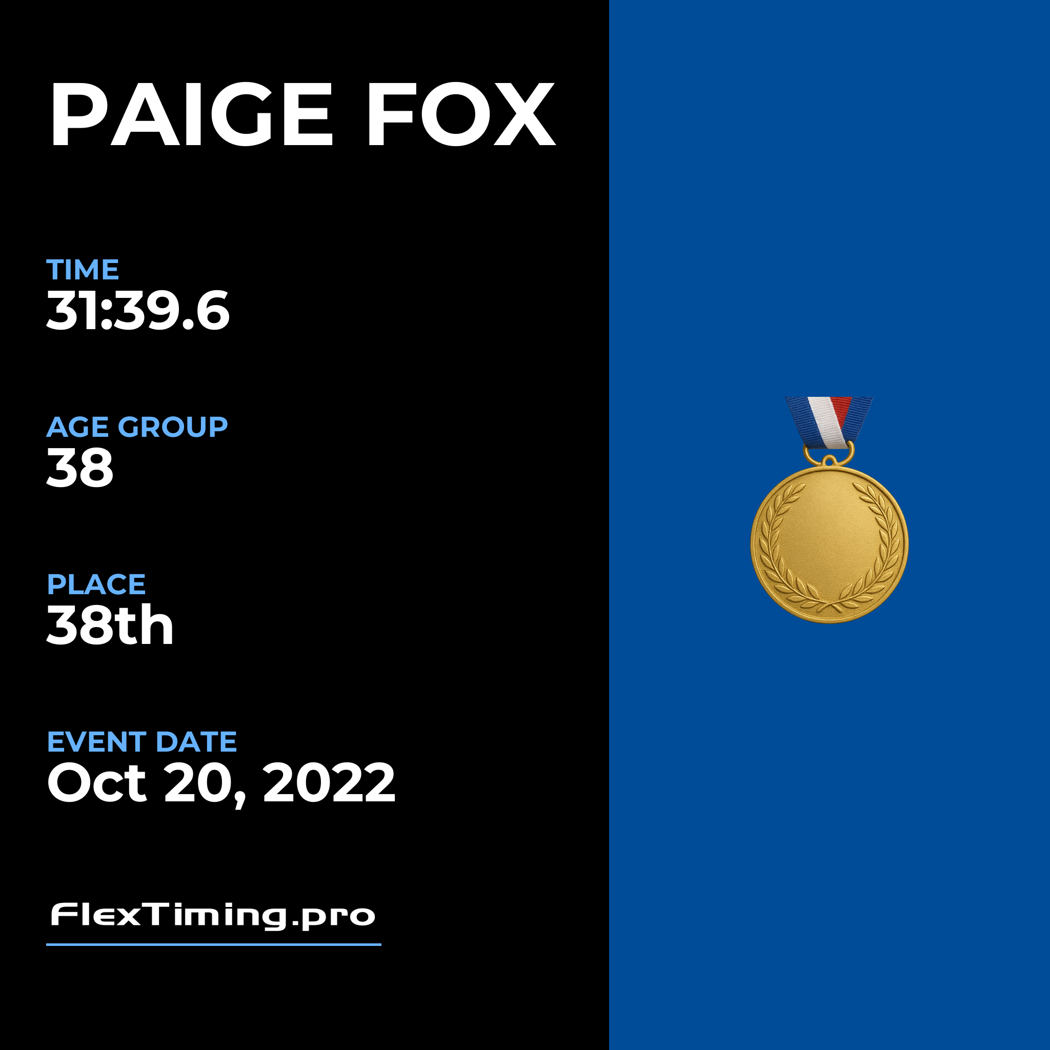 | Age Group Place: | 38 out of 40 Female in your Age Group. |