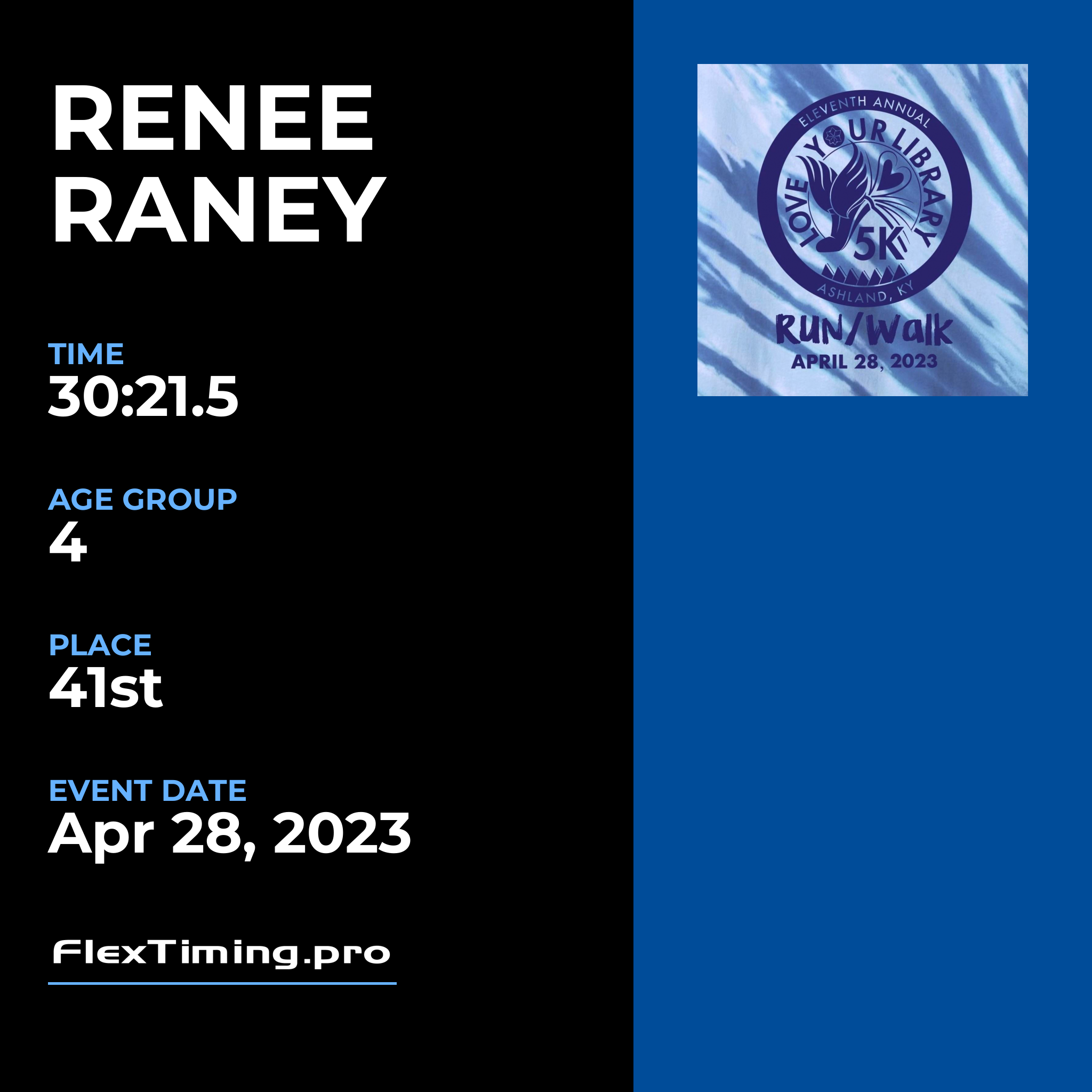 | Age Group Place: | 4 out of 13 Female in your Age Group. |