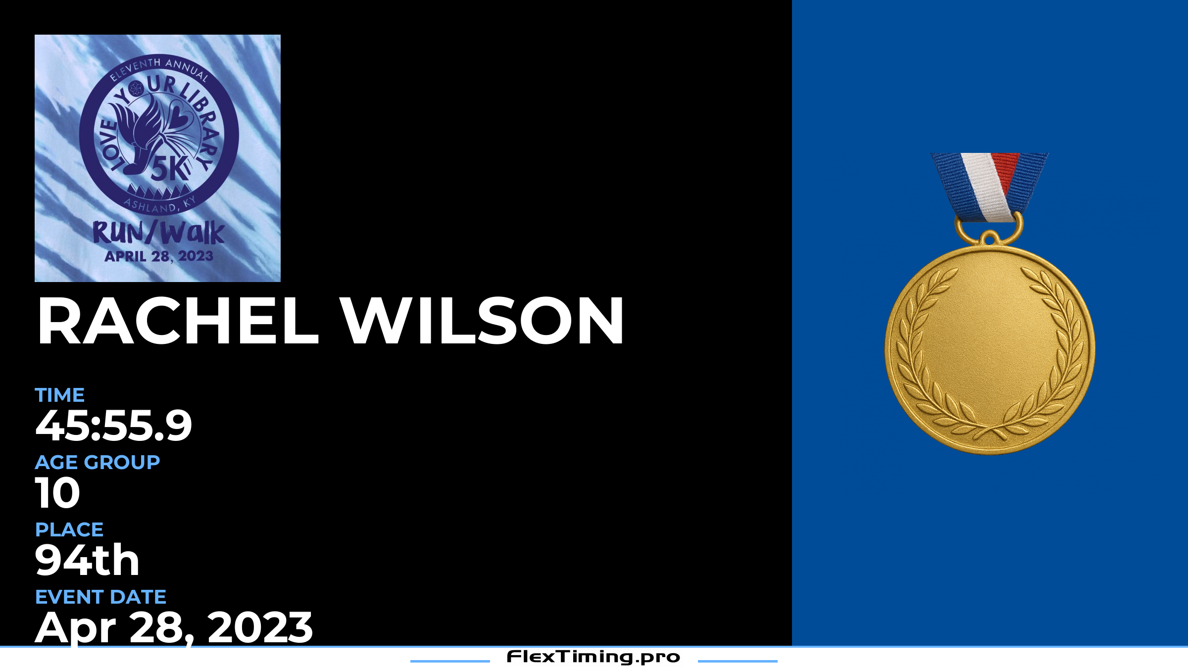 | Age Group Place: | 10 out of 13 Female in your Age Group. |
