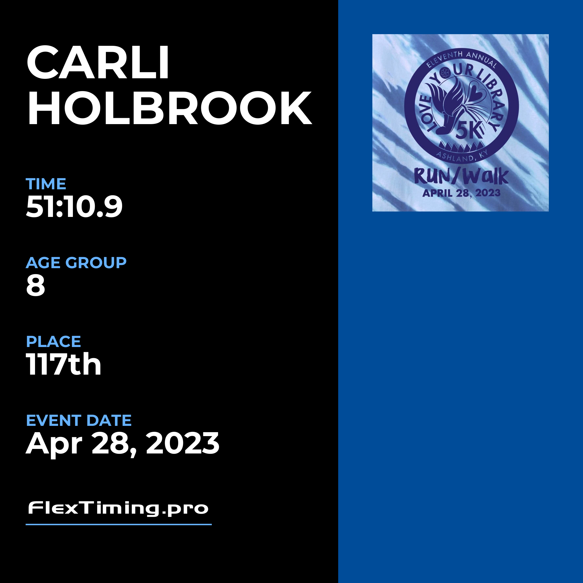 | Age Group Place: | 8 out of 11 Female in your Age Group. |