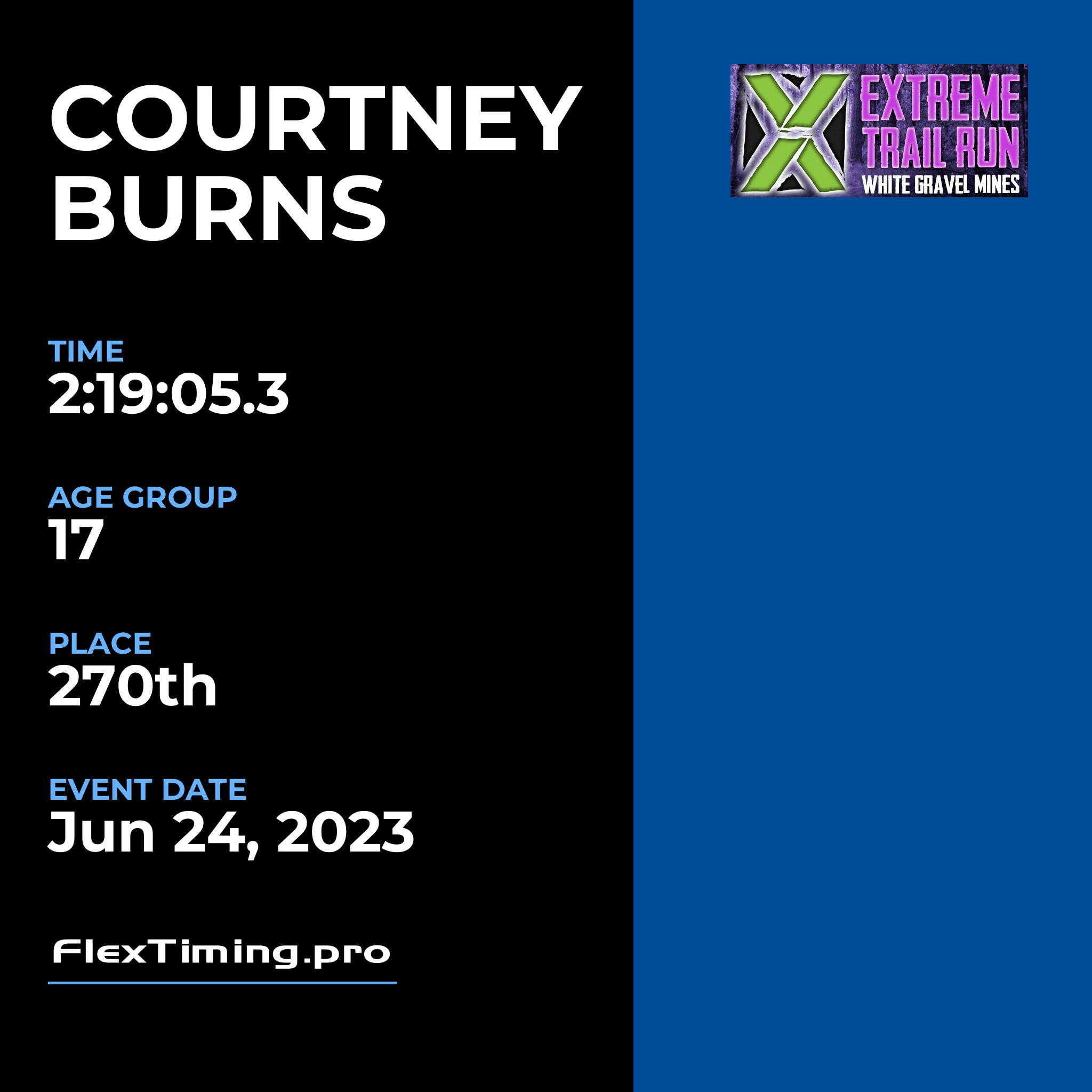 | Age Group Place: | 17 out of 17 Female in your Age Group. |
