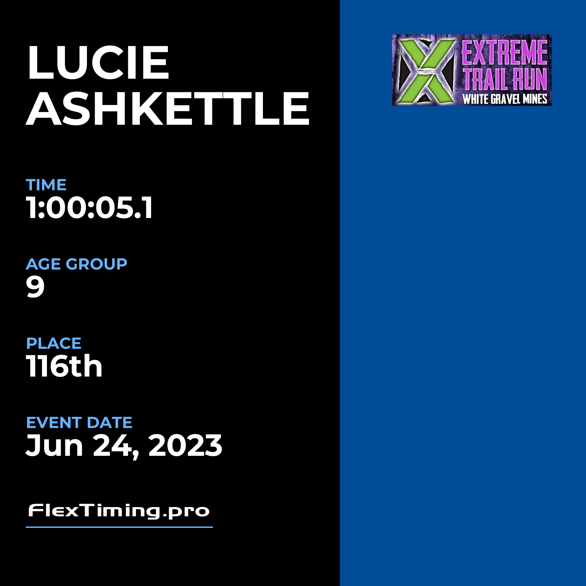 | Age Group Place: | 9 out of 18 Female in your Age Group. |