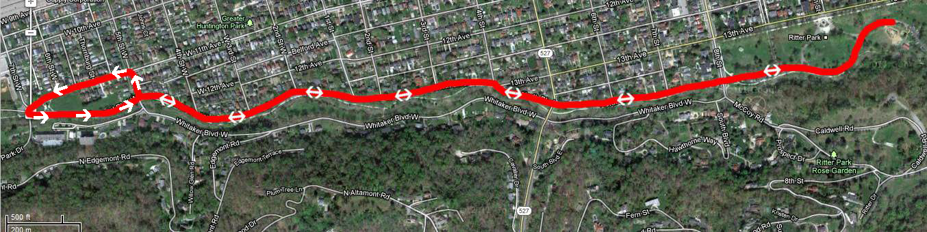 The Memorial Arch race route in Ritter Park, Huntington, WV, is a 5K out-and-back course starting near the playground at shelter #2. It proceeds west along North Blvd. to the Veterans Memorial Arch (near West 7th Street), turns, and returns to the park center Finish Line. This is a flat, paved route.